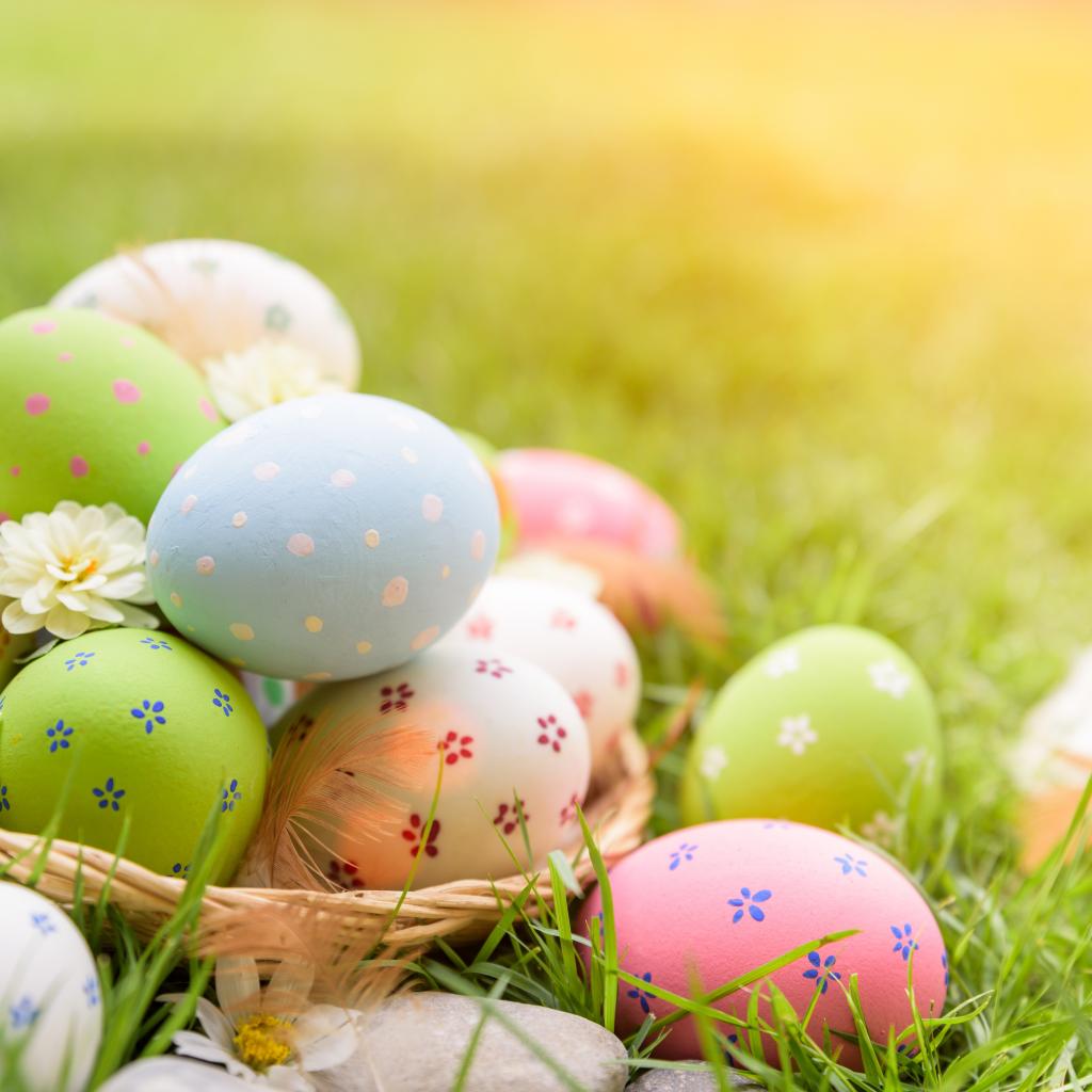 Обои Разноцветные пасхальные яйца в корзинке на зеленой траве