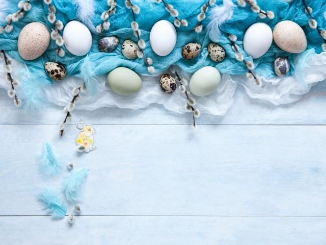 Обои Яйца на ткани с ветками вербы на столе