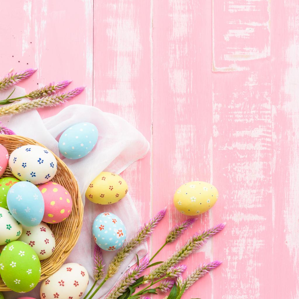 Обои Корзина с крашеными яйцами на розовом фоне