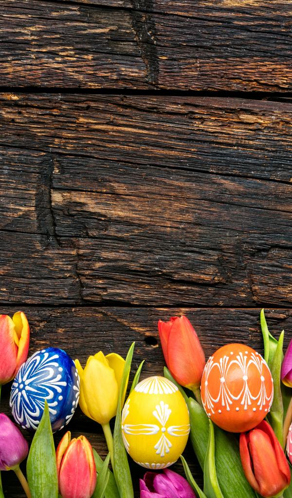 Обои Разноцветные яйца и цветы тюльпана, шаблон для открытки на Пасху
