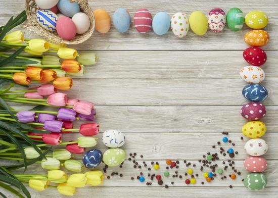 Обои Красивые разноцветные пасхальные яйца с букетом тюльпанов