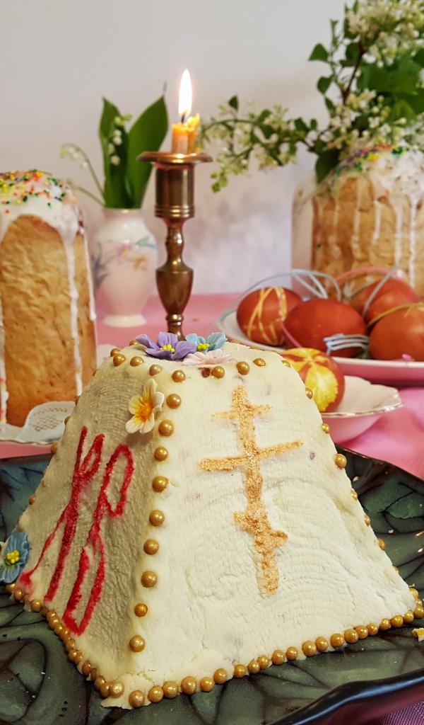 Обои Творожная паска на столе с крашеными яйцами и чаем