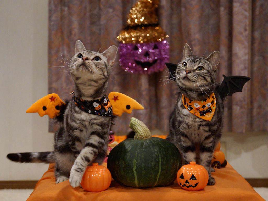 Обои Два серых кота в костюмах на праздник Хэллоуин