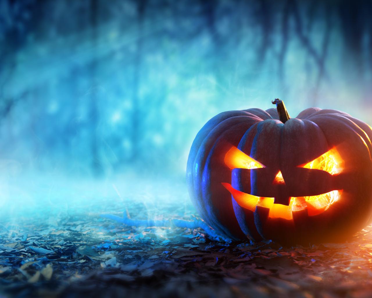 Обои Грозный фонарь тыква на листве на Хэллоуин