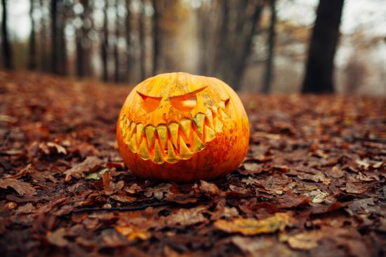 Обои Злобная тыква в лесу на листве на праздник Хэллоуин