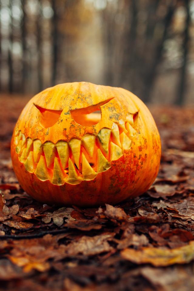 Обои Злобная тыква в лесу на листве на праздник Хэллоуин