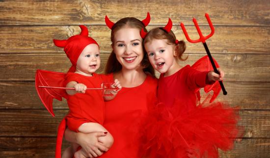 Обои Женщина с двумя детьми в красных костюмах на Хэллоуин