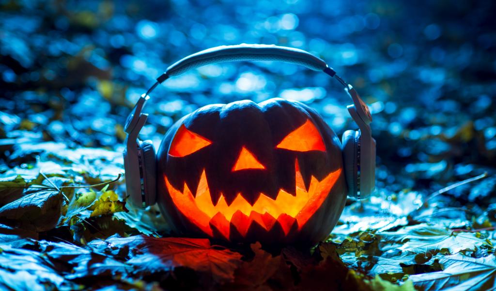 Обои Фонарь тыква в наушниках на земле на Хэллоуин