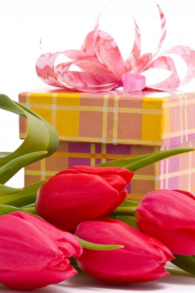 Обои Букет тюльпанов и подарок любимой на 8 марта