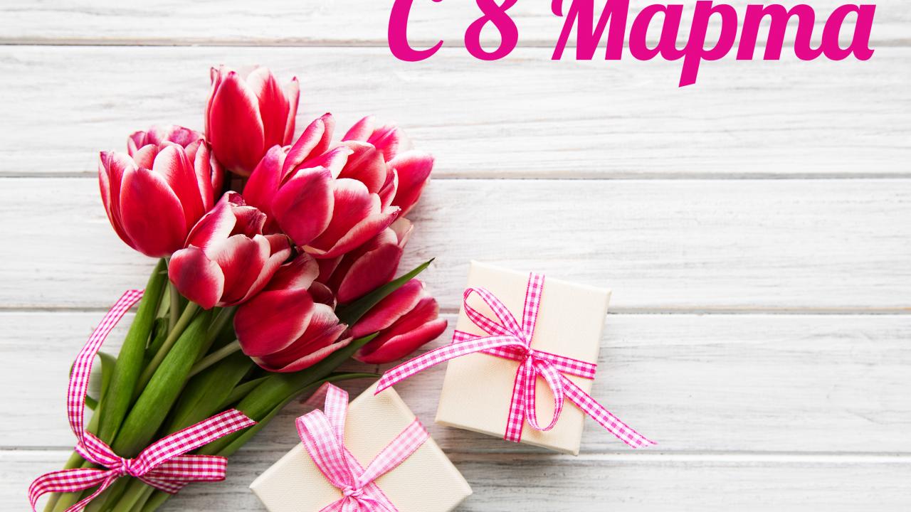 Обои Букет тюльпанов и подарки на 8 марта