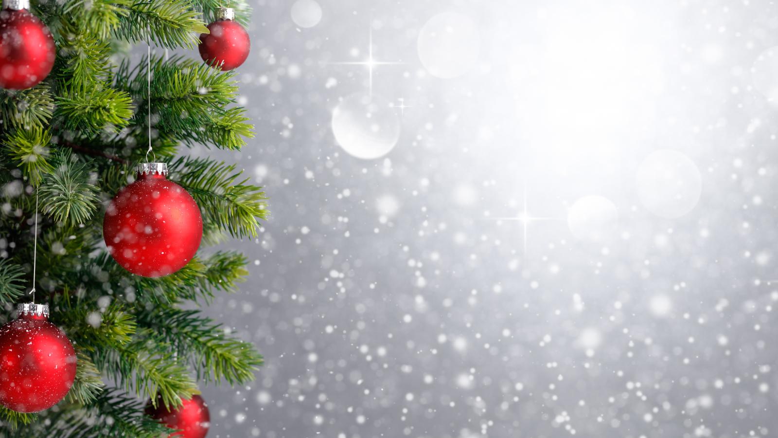 Обои Еловая ветка с красными шариками, фон для новогодней открытки