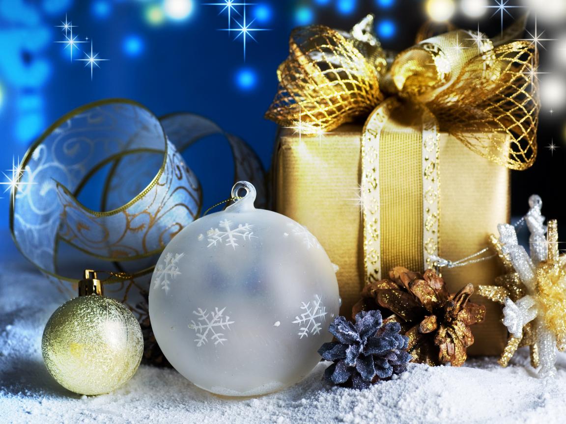 Обои Красивые елочные игрушки и подарок крупным планом