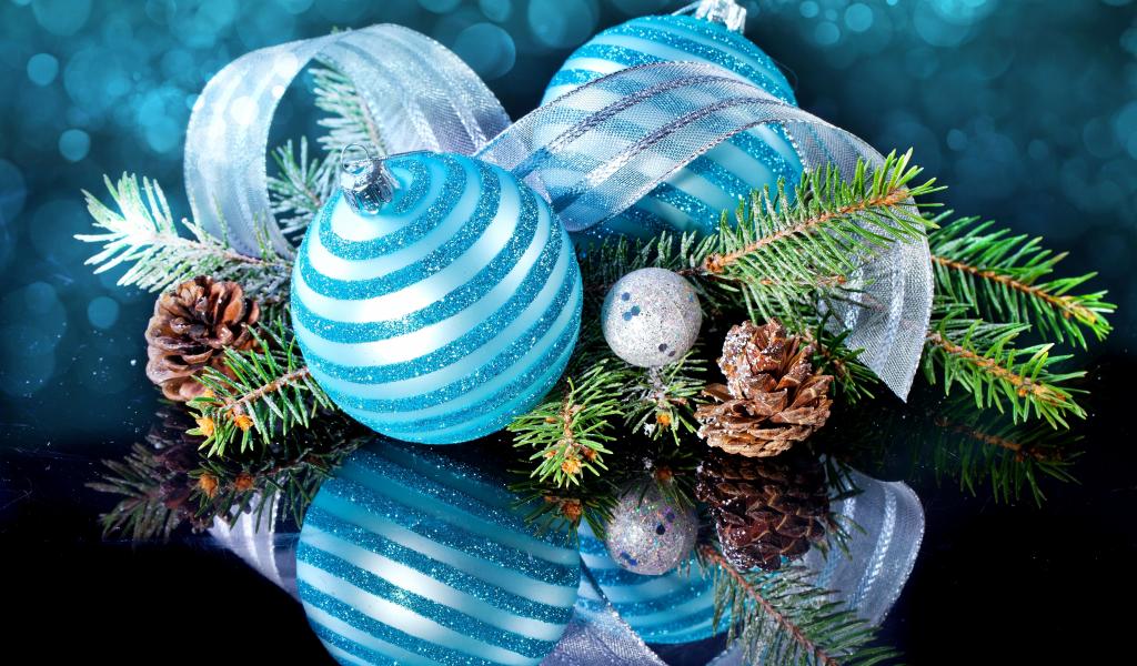 » Обои Яркие голубые новогодние шары с лентой и еловой веткой