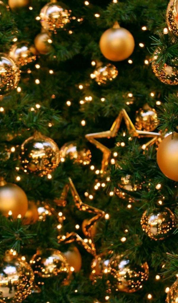 Обои Яркие елочные игрушки на зеленой елке