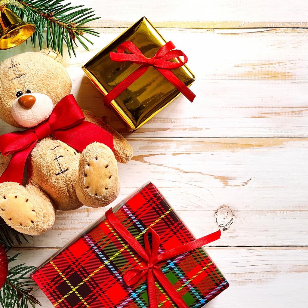 Обои Новогодние подарки с плюшевым медведем на Новый год 2018