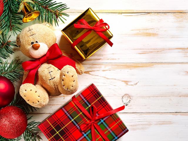 Обои Новогодние подарки с плюшевым медведем на Новый год 2018