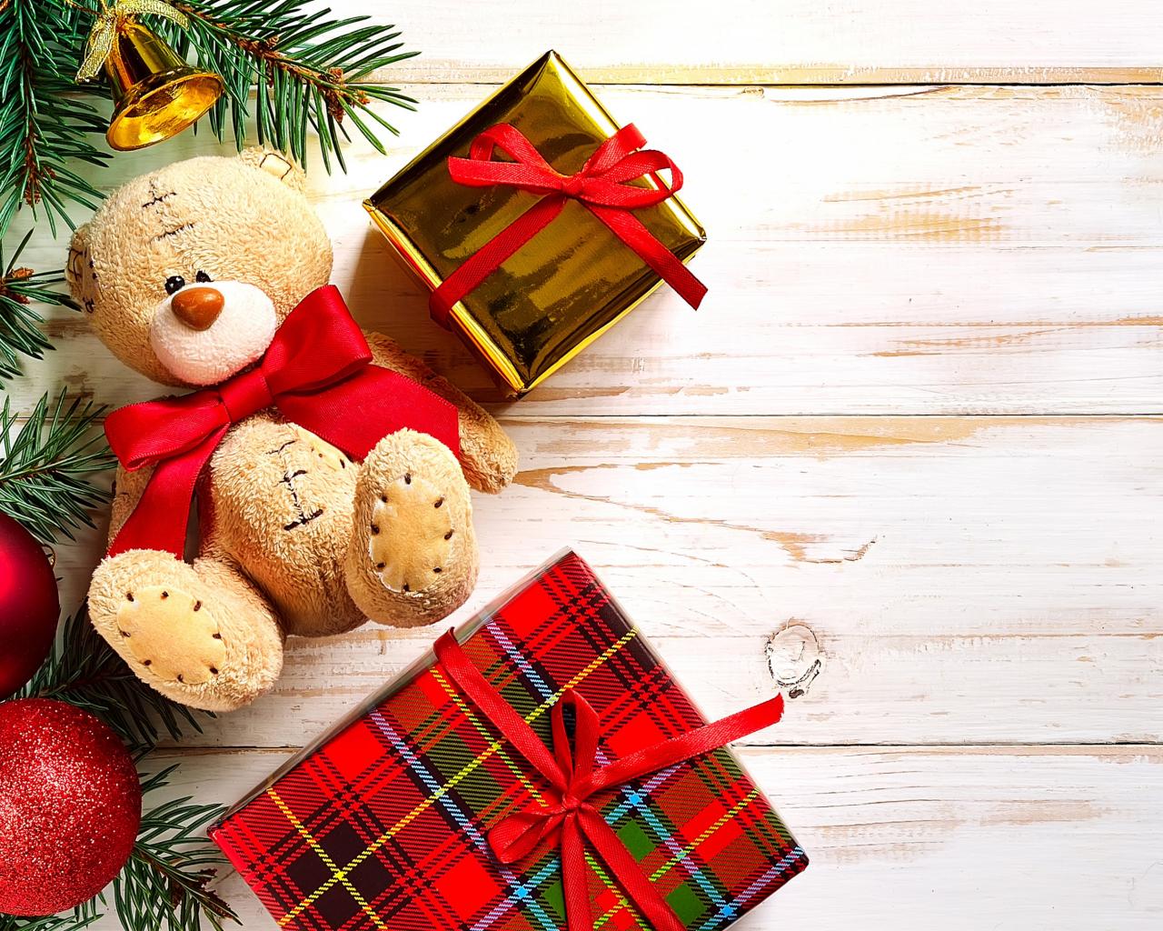 Обои Новогодние подарки с плюшевым медведем на Новый год 2018