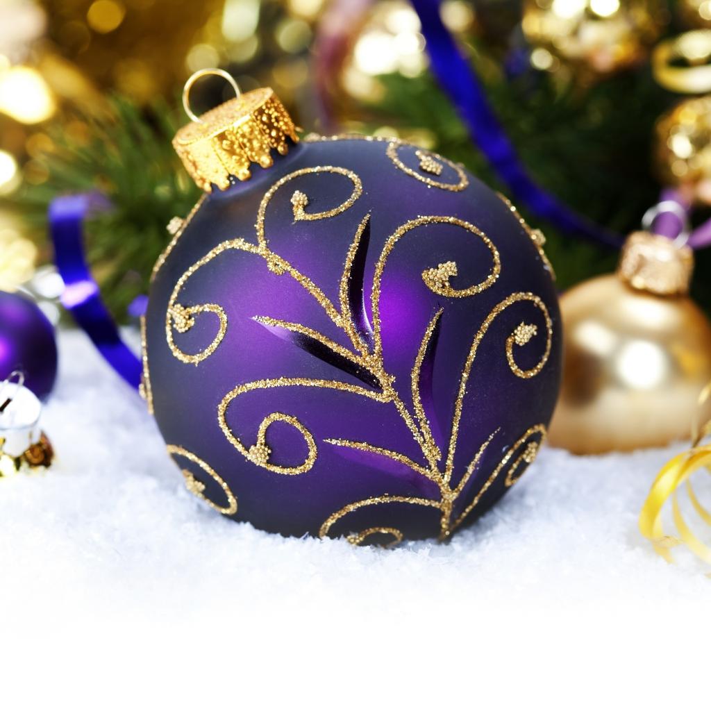 Обои Красивая фиолетовая елочная игрушка лежит на снегу
