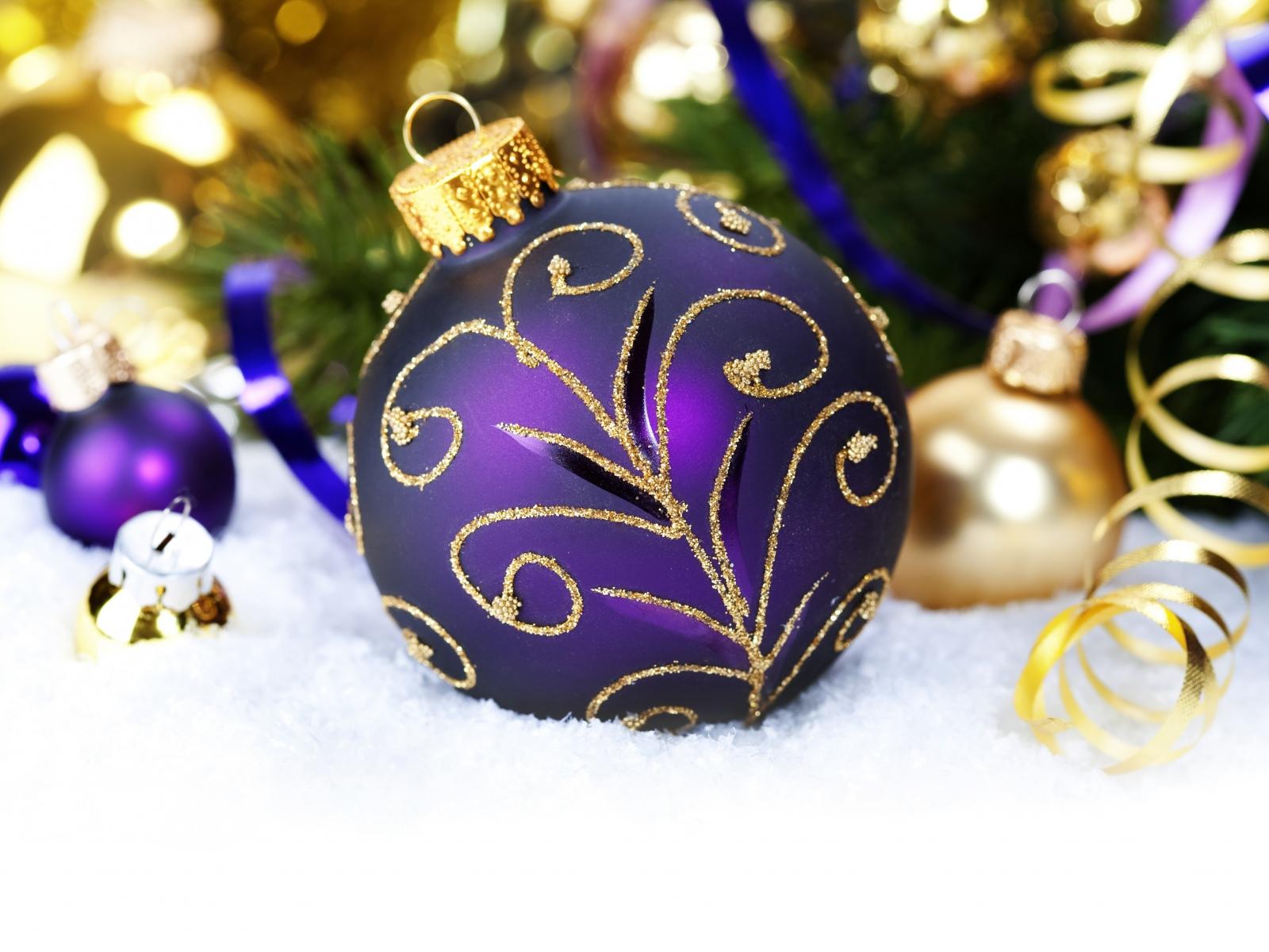 Обои Красивая фиолетовая елочная игрушка лежит на снегу