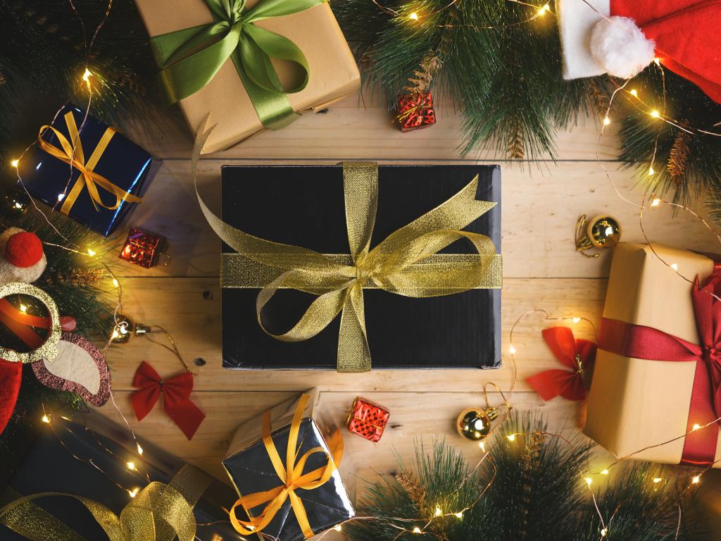 Обои Новогодние подарки с еловыми ветками и гирляндой