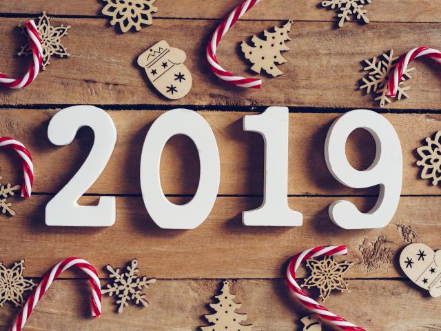 Обои Цифры 2019 с украшениями на деревянном фоне