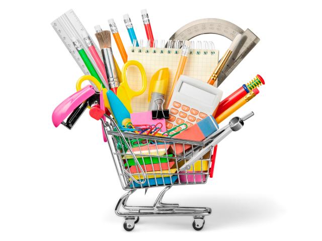 Обои Канцелярские школьные принадлежности в тележке на белом фоне