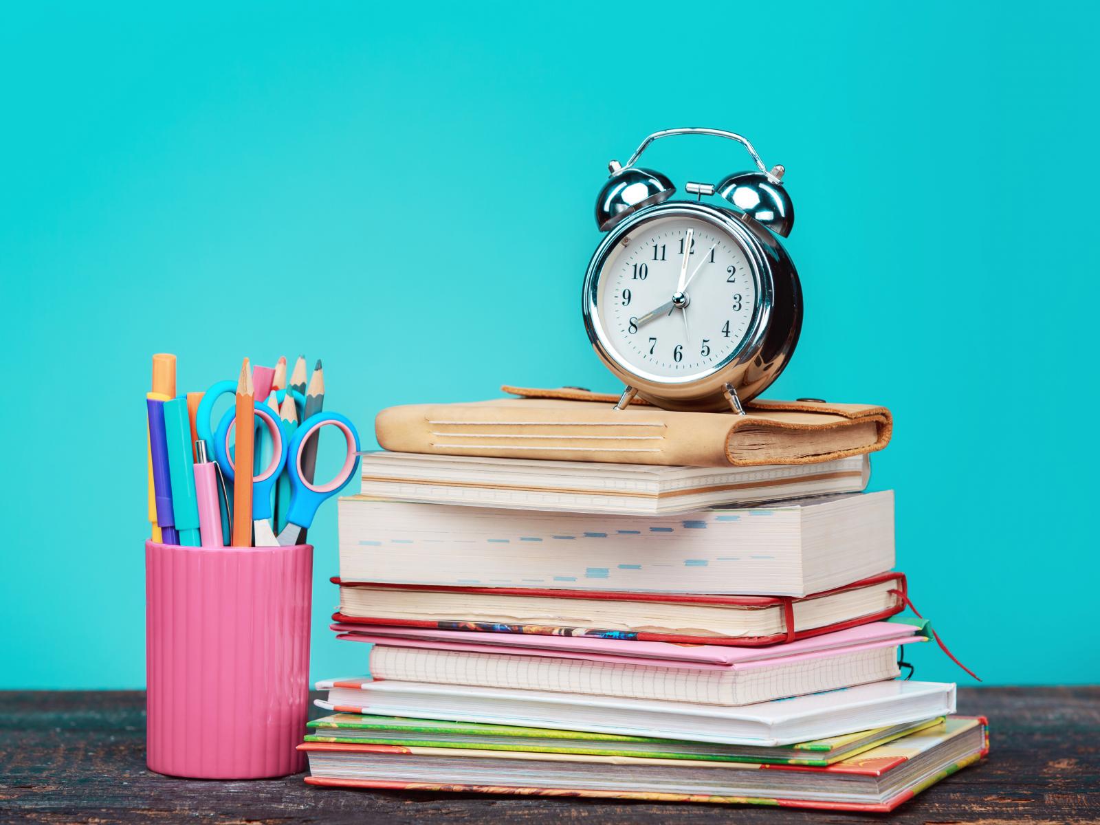 Обои Будильник, книги и канцелярские предметы для школы