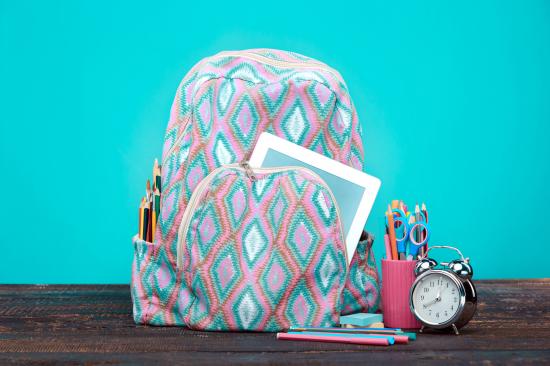 Обои Рюкзак, будильник и канцелярские предметы для школы