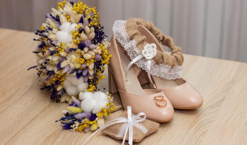 Обои Букет цветов, туфли и обручальные кольца