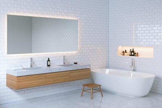 Обои Ванная комната с белыми стенами и большим зеркалом