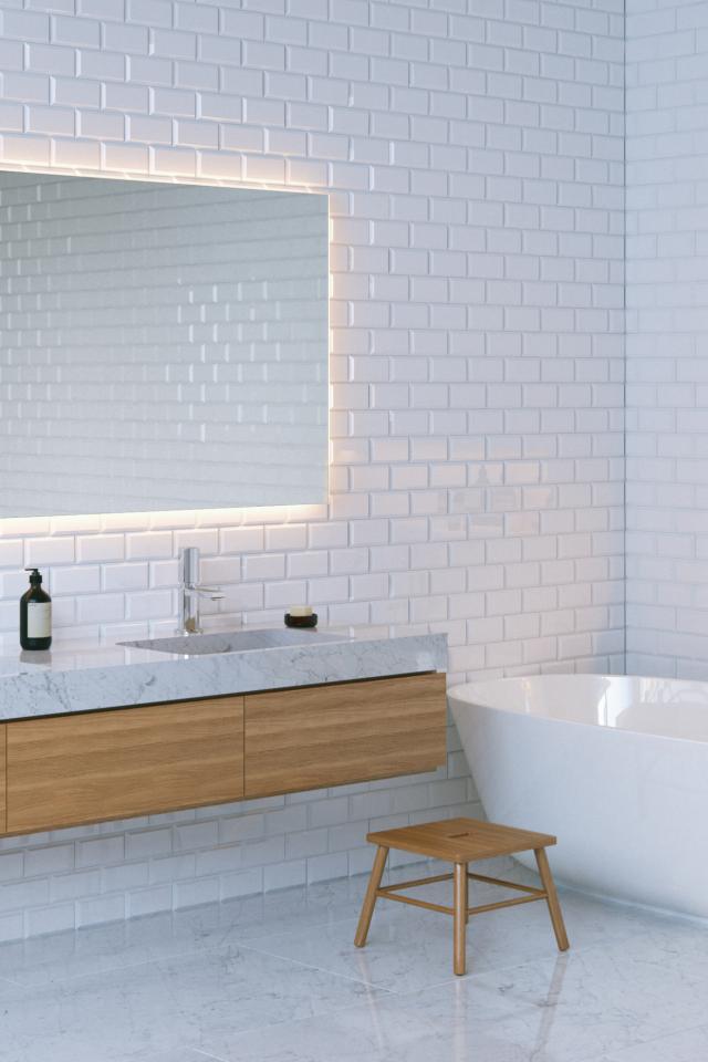 Обои Ванная комната с белыми стенами и большим зеркалом