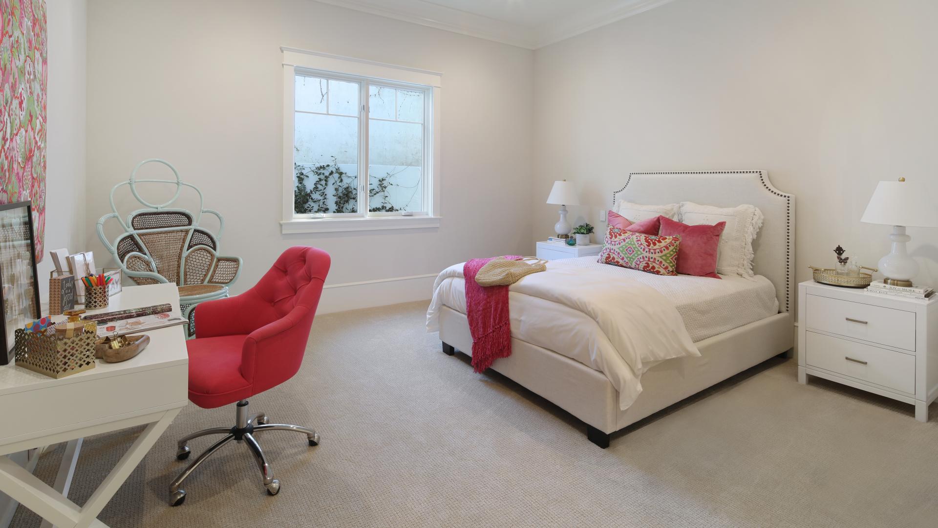 Обои Спальня в светлых тонах с кроватью и столом с красным креслом