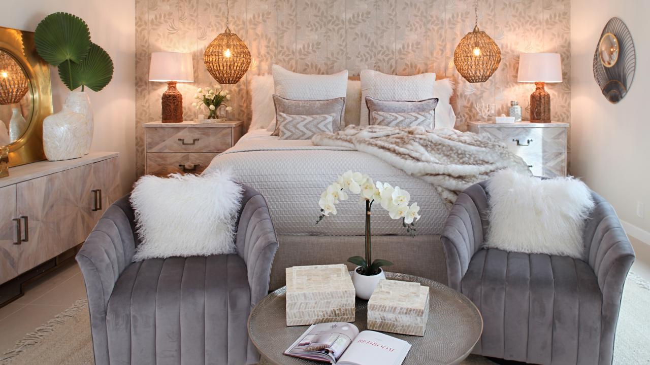 Обои Интерьер спальни с большой кроватью и двумя креслами