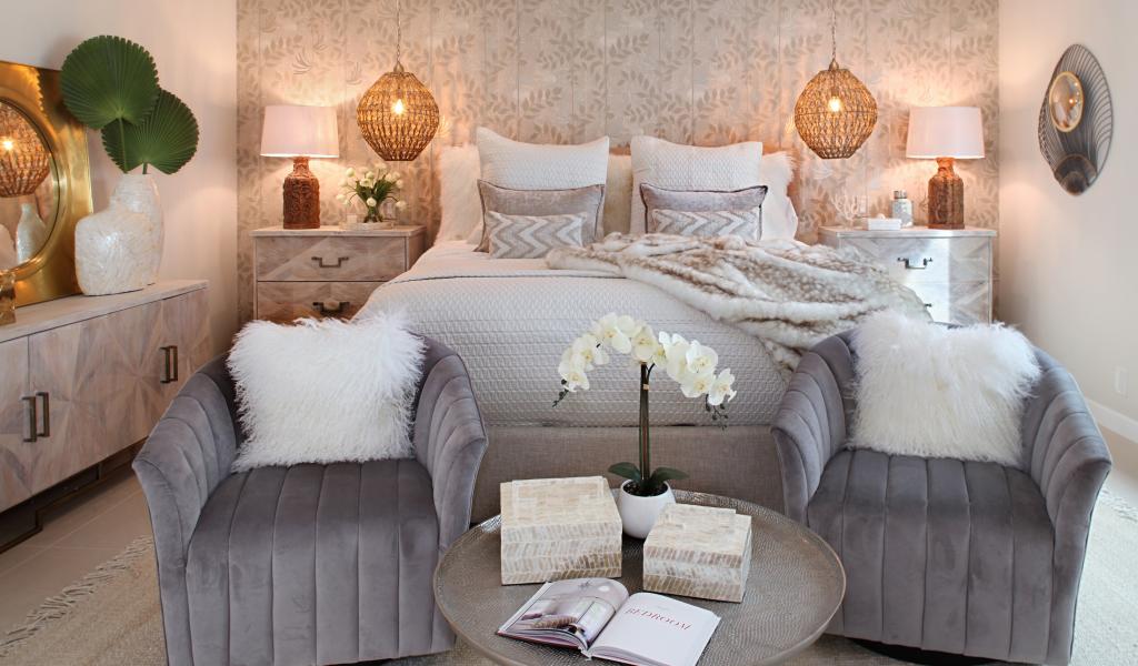 Обои Интерьер спальни с большой кроватью и двумя креслами