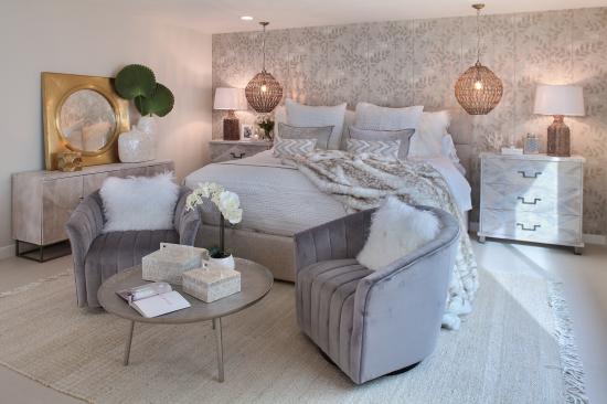 Обои Серая спальня с большой кроватью и креслами