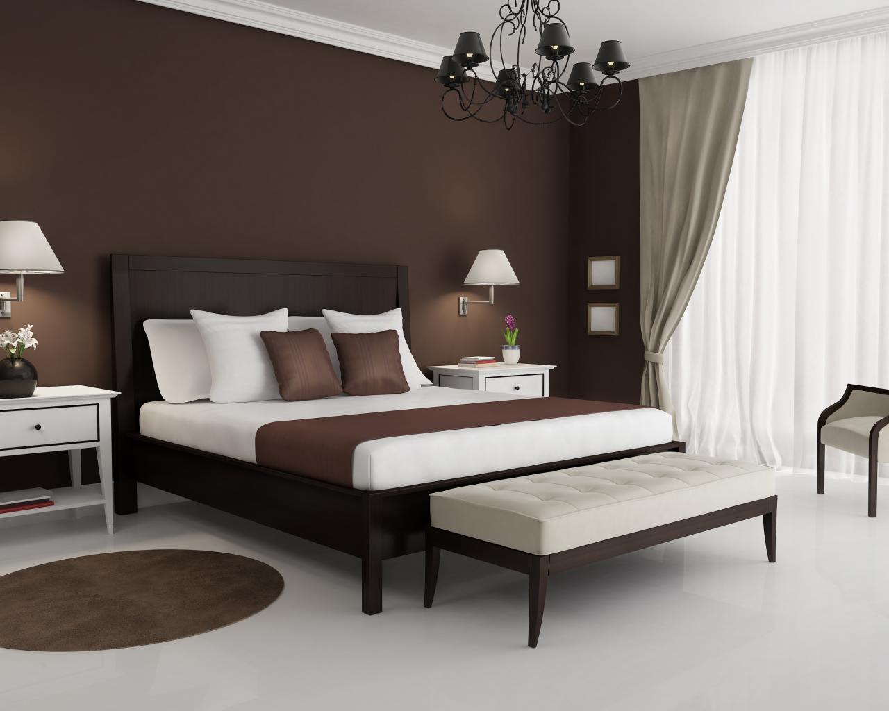 Обои Спальня с большой кроватью в коричнево белых тонах