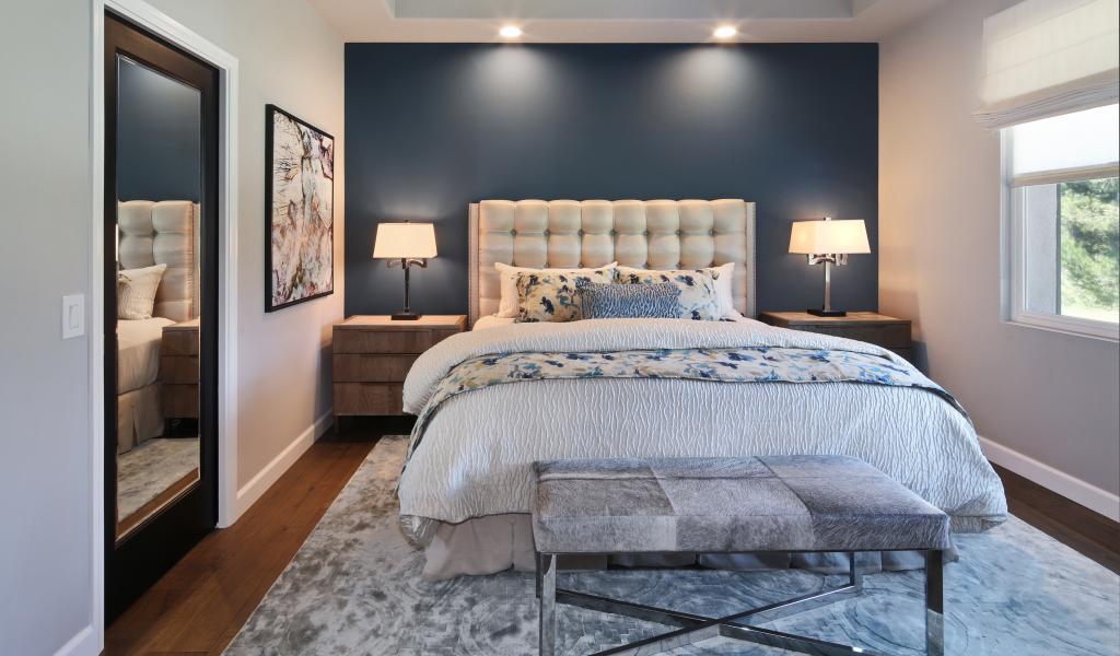 Обои Спальня в серых тонах с большой кроватью