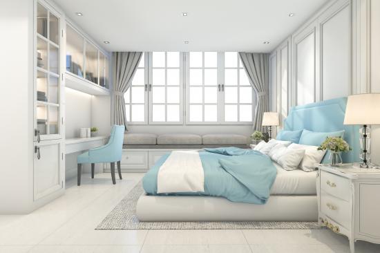 Обои Большая спальня в серых тонах с кроватью и окнами
