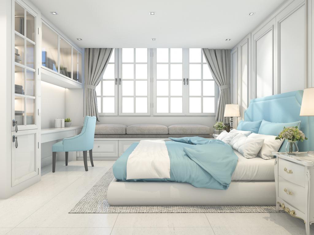 Обои Большая спальня в серых тонах с кроватью и окнами