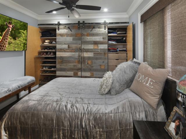 Обои Большая серая кровать в спальне с деревянным интерьером