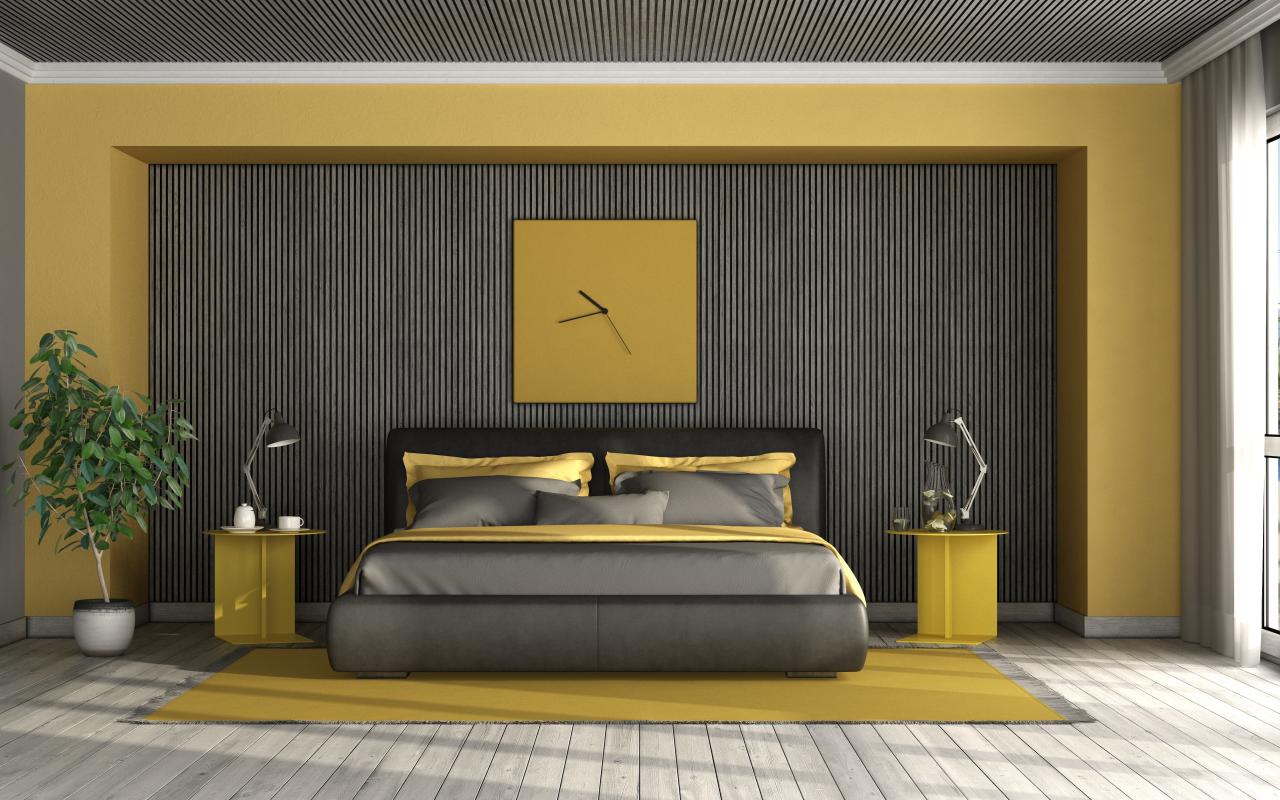 Обои Большая черная кровать стоит у стены с часами