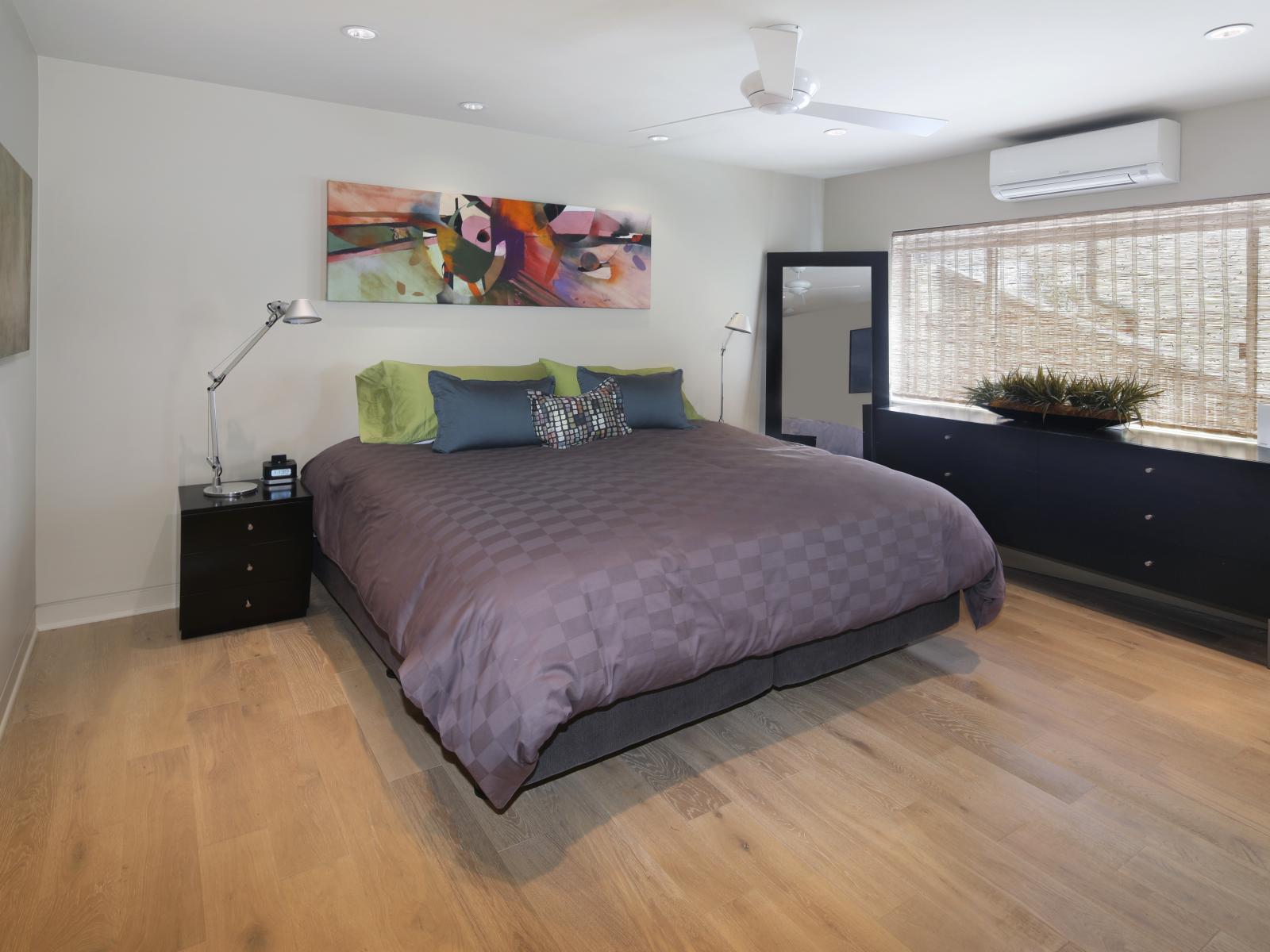 Обои Большая серая кровать в спальне с белыми стенами