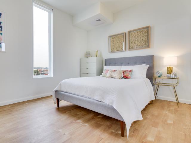 Обои Высокое окно в спальне с большой кроватью