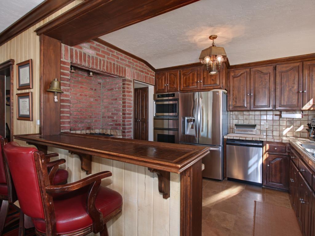Обои Просторная кухня с деревянной мебелью и кожаными стульями