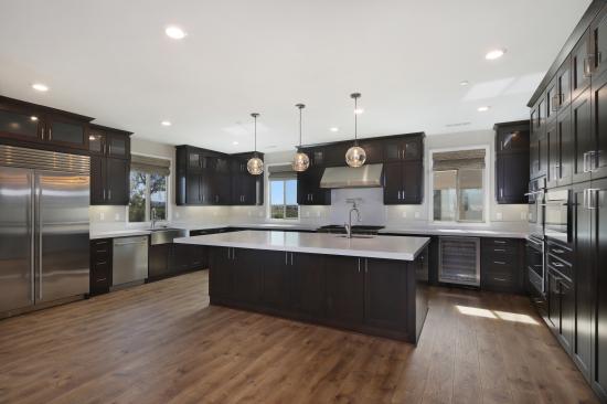 Обои Большая просторная кухня с мебелью в коричневых тонах