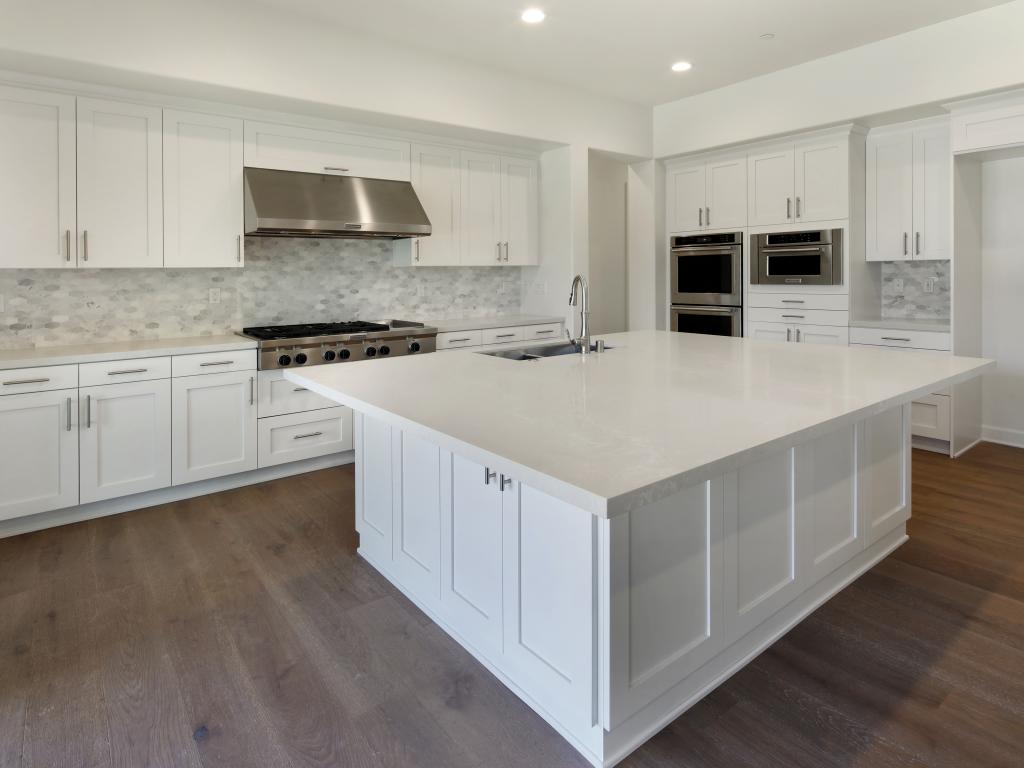 Обои Большая красивая кухня в сером цвете с деревянным столом