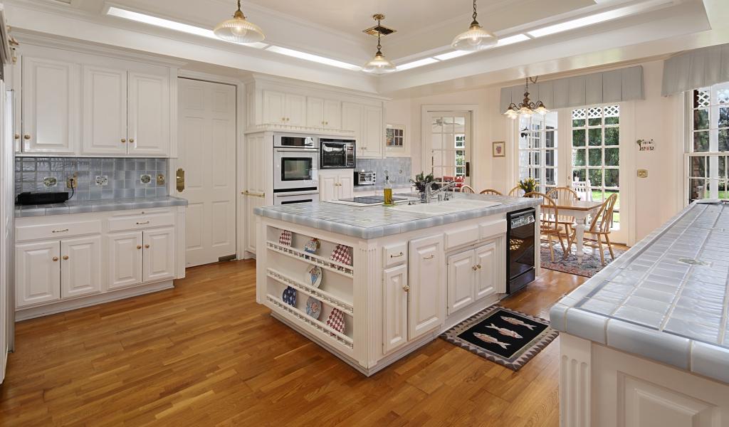 Обои Белые стены и мебель на просторной современной кухне