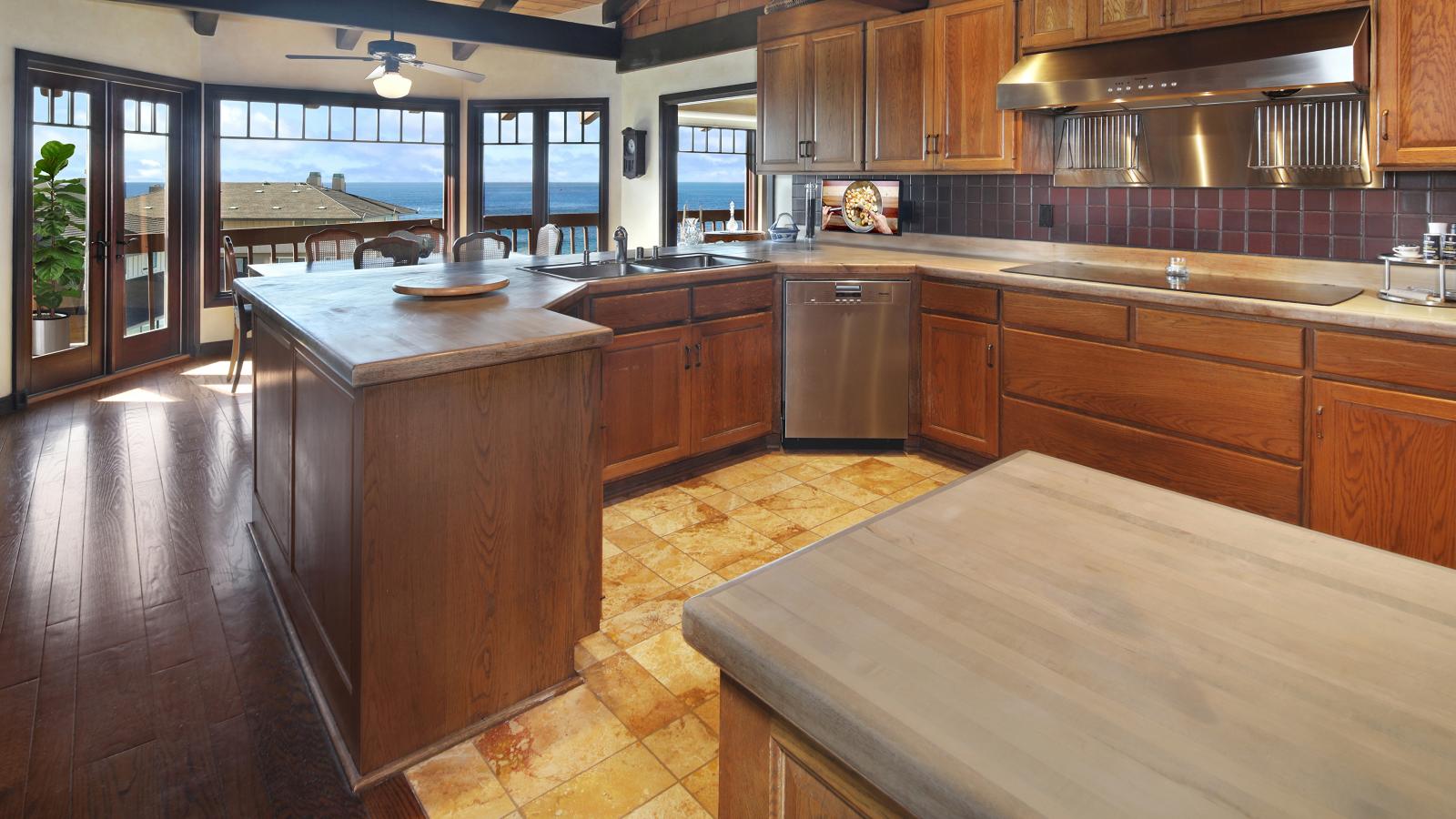 Обои Деревянная мебель на кухне с окнами с видом на море