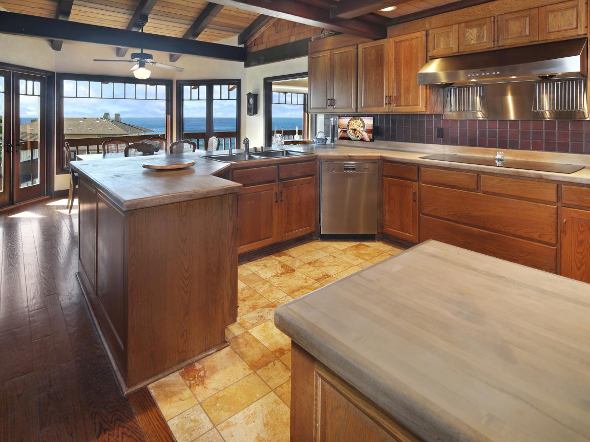 Обои Деревянная мебель на кухне с окнами с видом на море