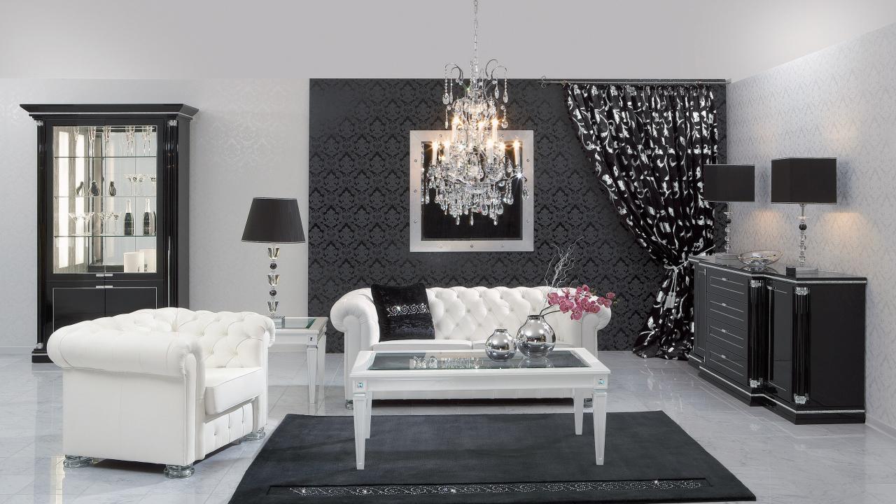 Обои Гостиная в серых тонах с большой хрустальной люстрой
